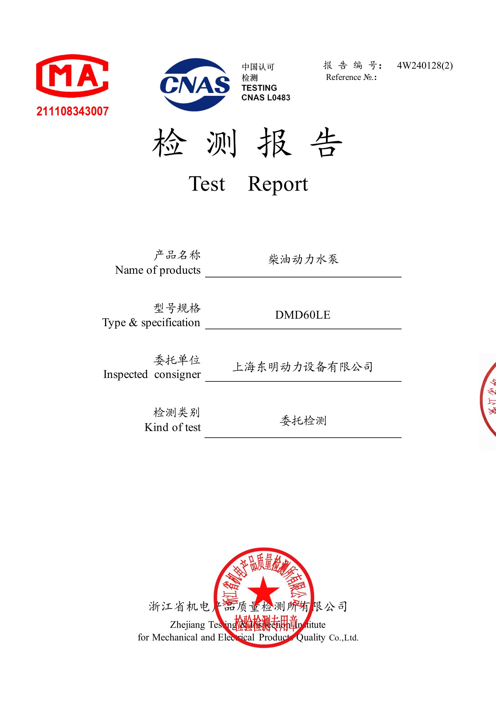 • 上海東明 DMD60LE 機組具備專業檢測報告,符合產品合規要求。